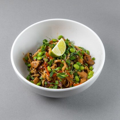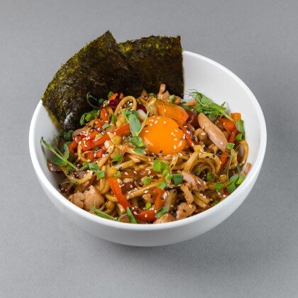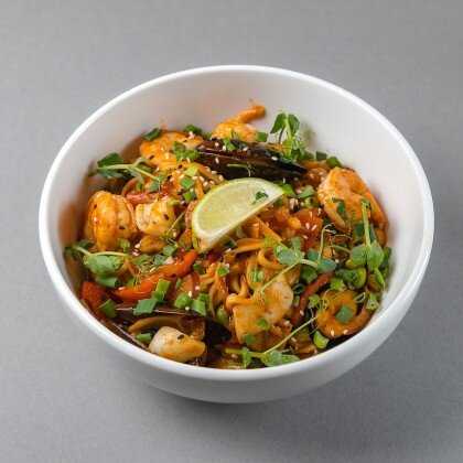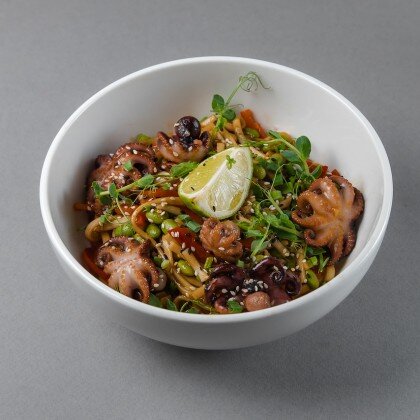 Рис или лапша, имбирь, чеснок, бульон рамен, зеленый лук, кунжут, репчатый лук, бобы эдамаме, болгарский перец, соус устричный, кальмары , грибы шампиньоны, красный лук